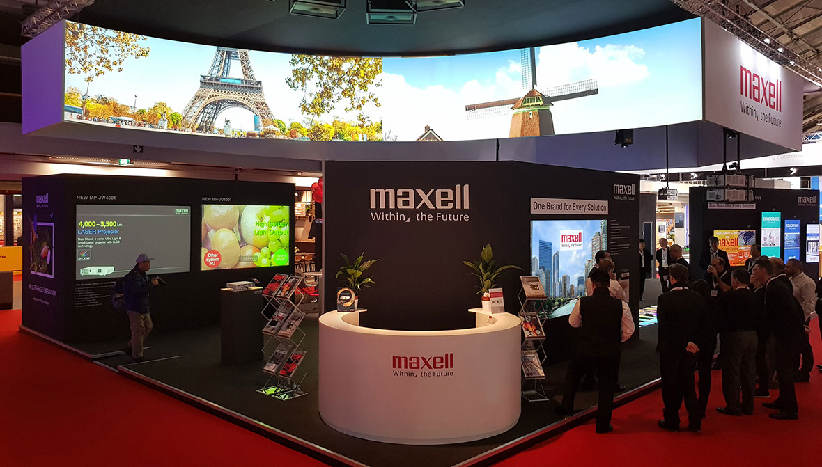 MAXELL exhibit at ISE held at the RAI in Amsterdam. These custom-built exhibition stands showcase the very best of Hitachi’s range of projectors. The stands were produced to a height of 6 meters and utilising the latest in tensile fabric construction methods, we were able to achieve a variety of different large format projection surfaces.