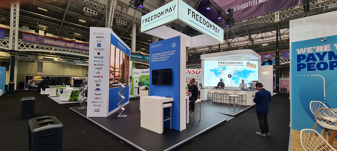 The FreedomPay stand was designed and due to be delivered back in 2020 just as the pandemic hit. So we put everything on hold until the Retail Expo show was reinstated in 2022. The fully custom built stand contained a fully illuminated header structure and lighting rig, a bar, a presentation suite, 6 square metres of video wall, reception desk.
